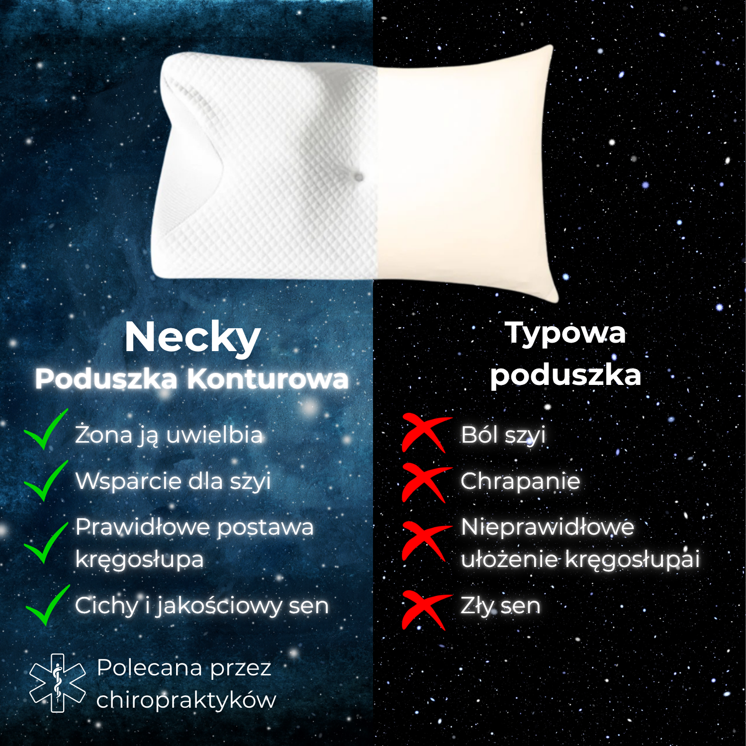 Poduszka Necky to ergonomiczna poduszka z pianki memory, która dopasowuje się do kształtu Twojej szyi i głowy. Łagodzi ból, wspiera prawidłową postawę i poprawia jakość snu – wszystko po to, abyś budził się wypoczęty i bez napięcia w karku.